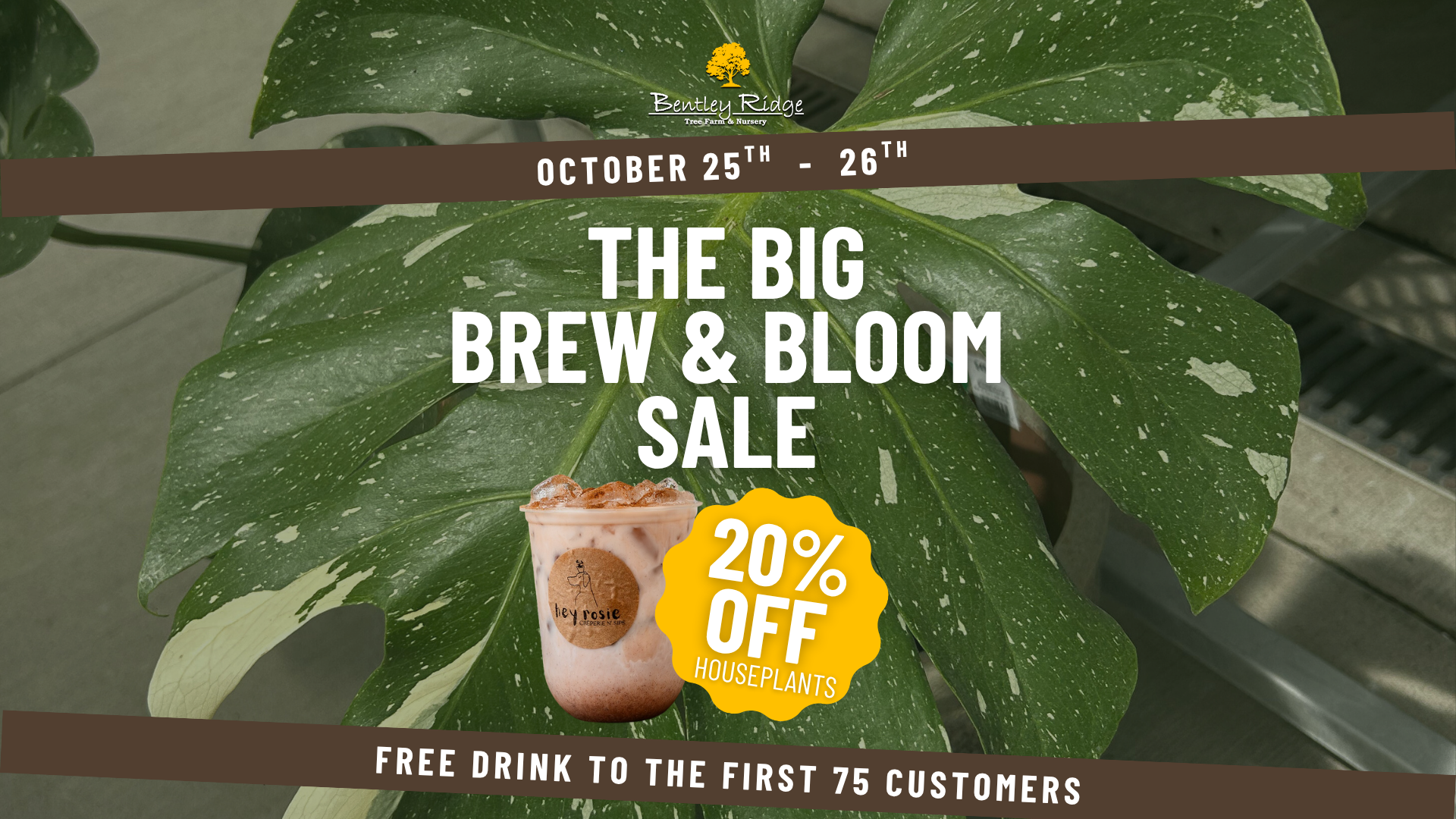 Join us for a fall weekend surrounded by plants, coffee, and good vibes! Bentley Ridge Tree Farm is hosting The Big Brew & Bloom Sale, where all houseplants are 20% off and our greenhouse will be freshly stocked with beautiful, healthy plants ready to find their new homes.